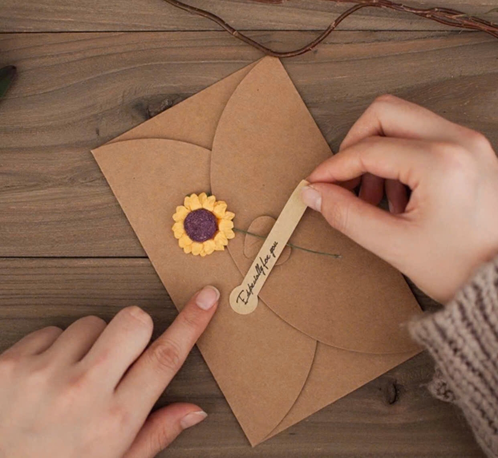❤ 1 set gồm: 1 thiệp hoa + 1 bao thư kraft nút gài + 1 dây thừng + 1 tag